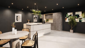 Cette cuisine linéaire se distingue par son ambiance naturelle et chaleureuse. La niche décorative en alcôve apporte légèreté et profondeur aux volumes, tandis que l’îlot en L avec cuisson et évier organise l’espace de manière pratique. Le bar en prolongement de l’îlot crée un coin convivial, idéal pour partager un repas ou un moment de détente. Les couleurs Seta Greige strié et laque mate verte renforcent l’atmosphère authentique et apaisante.