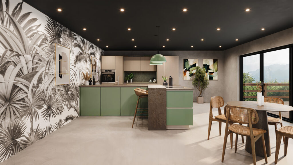 Cette cuisine linéaire se distingue par son ambiance naturelle et chaleureuse. La niche décorative en alcôve apporte légèreté et profondeur aux volumes, tandis que l’îlot en L avec cuisson et évier organise l’espace de manière pratique. Le bar en prolongement de l’îlot crée un coin convivial, idéal pour partager un repas ou un moment de détente. Les couleurs Seta Greige strié et laque mate verte renforcent l’atmosphère authentique et apaisante.