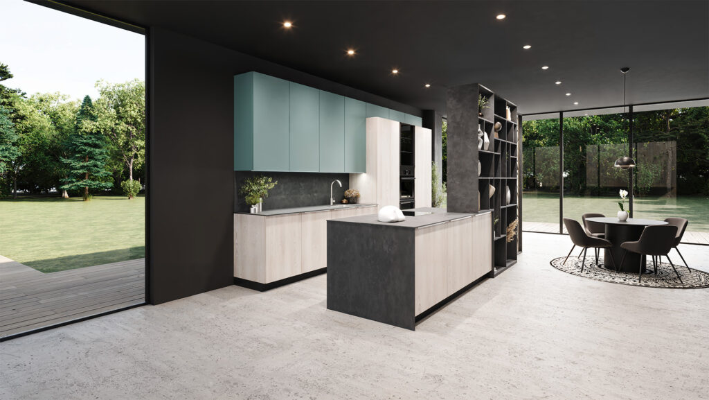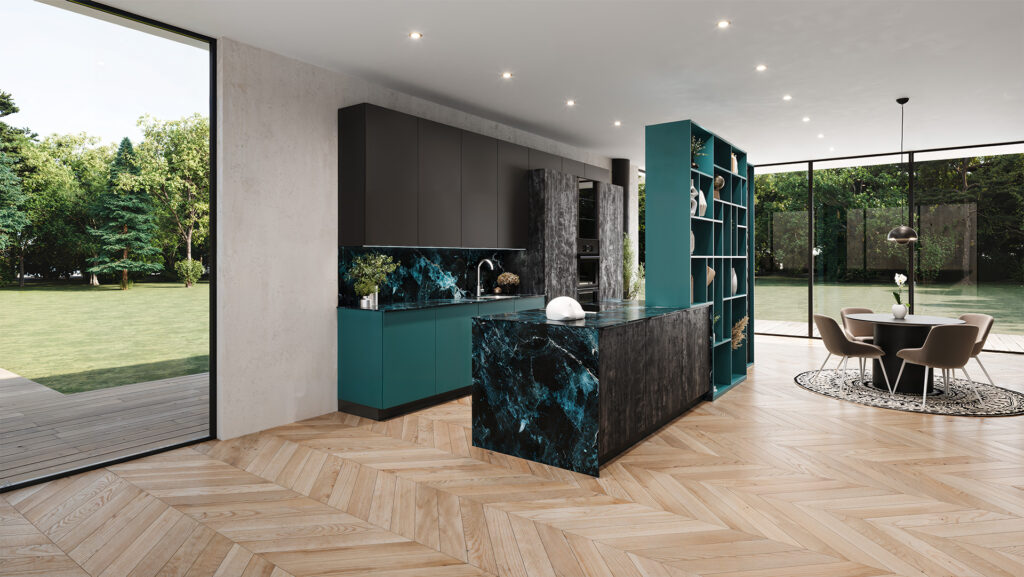 Le contraste entre la texture chaleureuse du Stria Guarana et la laque mate verte crée un agencement à la fois original et harmonieux. Les touches noires des poignées soulignent la modernité et apportent graphisme et rythme, pour une cuisine au style affirmé et cohérent.